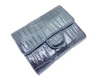 New model of trifold wallet for women made from genuine Siamese crocodile belly part, with very nice texture of crocodile skin. For manufacturing of this wallet used soft and elastic croc skin, what show on high quality of tanning of crocodile leather. This is very compact and very roomy wallet. Wallet consist from one banknotes compartment, six cards slots and four sides pockets. Wallet closing on button. Calfskin and textile used as a lining material.