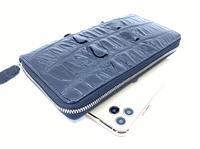 Crocodile leather wallet wit 1 zip – Large size. For manufacturing of wallets this model used genuine Siamese crocodile skin. Used crocodile skin soft and supple and high quality leather. As a main decoration used skin taken from middle part of tail of Siamese crocodile hide. Wallet opens 180 degrees, on the left side of wallets 8 card slots and two side pockets behind card slots. On the right side of wallet- 12 slots for cards, 1 flat pocket behind of card slots, 1 flat pocket with zip and 2 banknotes compartments around zip pocket. As a lining material used calfskin and textile.