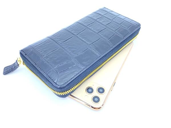 Crocodile skin middle tail part with handmade braided trim of wallet, on face of wallet used tail part of crocodile hide. Wallet consist from two compartments for banknotes, one compartment with zip, 5 cards slots, one coins pocket, two side pocket with access from middle part of wallet. And two compartments with transparent windows. As a lining material used calfskin and textile.