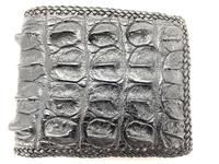 Crocodile skin middle tail part with handmade braided trim of wallet, on face of wallet used tail part of crocodile hide. Wallet consist from two compartments for banknotes, one compartment with zip, 6 cards slots four side pockets with access from middle part of wallet. As a lining material used calfskin and textile.