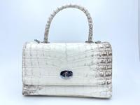 Women’s crocodile skin handbag made from genuine crocodile leather belly part of Siamese crocodile skin himalayan color. On the top of handbag located handle and D-ring for shoulder belt. On the face surface of handbag located valve what closing on stainless lock. On the back surface of this crocodile skin handbag located patch pocket. Side parts of handbag are made from crocodile skin. Bottom part made from crocodile skin. As a lining material used calfskin. This crocodile skin handbag available in different colors.