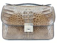 Men’s crocodile skin handbag. For manufacturing of this handbag used soft and supple caiman crocodile skin. On the main surface of valve located beautiful nape of crocodile hide. On back side of handbag located hornback part of hide of caiman crocodile. Inside bag consist from two volumes. Under valve located folding pocket.