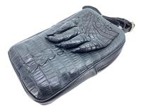 Small size shoulder bag for men with crocodile skin and crocodile paw decoration. Model of this bag made for those of people who like to use small bags. The bag where can put just the immobilizer key for car, key house, wallet, pack of cigarettes and cellphone maybe. Just make your pockets free from some of common using things. As main decoration of this bag on main surface used crocodile skin with unique texture of tail part of young crocodile and real crocodile paw with claws. Back Side, side parts, bottom part and top around zip made from soft calfskin of black color. On backside of bag located two stainless steel rings for fixing of shoulder belt. Nylon strip use as the shoulder belt, for decoration of shoulder belt we use strip of black crocodile skin on the top of nylon strap. Shoulder belt on this model adjustable but not detachable. Minimum distance from the top of the bag up to shoulder belt is - 40cm and maximum distance from top of the bag up to the shoulder belt is – 80 cm. Let look inside of bag, soft cloth of brown color use as a lining material, inside of bag located two pockets one pocket with zip and one more flat pocket on opposite side of bag.