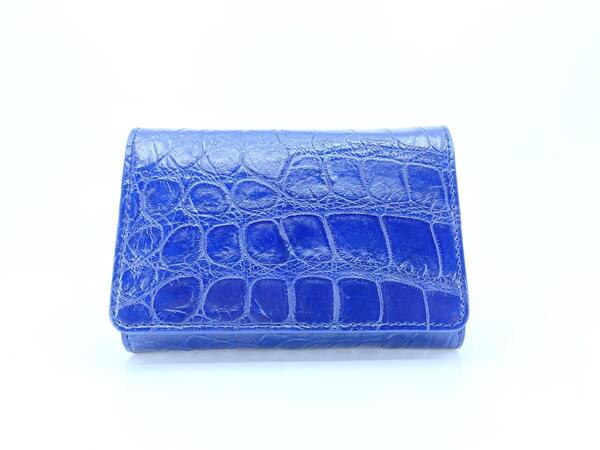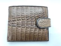 Crocodile skin wallet with coins compartment and strap, with texture of tail part. For manufacturing of this wallet used genuine crocodile skin, caiman tail part. Used crocodile skin soft and supple. Wallet consist from: Two banknotes compartments, One flat zip compartment inside of one banknote compartment, five card slots, two ID cards slots with transparent windows, one pocket for coins and four side pockets with access from the middle of the wallet. As a lining material used calfskin and textile.