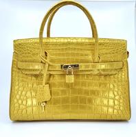 Women’s crocodile skin handbag made from belly part of Siamese crocodile skin. Prototype of this bag is famous Hermes Birkin. This bag is not copy or replica of Birkin. As main decoration of this bag is belt from crocodile skin around the top of bag which crowned by lock. All parts of this bag made from crocodile skin, main surface, back part, side parts, bottom part, handles, and long shoulder belt, all of those parts made from crocodile skin. On the left and right side of main volume of bag located two big flat pockets. Bag inside made in one volume, inside has one flat zip pocket and two patch pockets. Calfskin used as lining material.