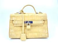 Crocodile leather women’s handbag copy of Kelly. On the top of handbag, located crocodile handle and rings for shoulder belt.