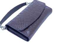 Women's clutch made of genuine crocodile leather. The upper part of the clutch has a removable handle. Inside clutch consist from several compartments, including a zipper. The clutch comes with a removable shoulder strap. Calfskin and textiles come with the bag.