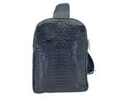 Sling bag made of genuine crocodile leather, the back part of the skin is caiman, the front part of the bag is decorated with crocodile leather, the back part of the bag is made of calfskin. A convenient U-shaped metal zipper is sewn into the upper part of the bag. Inside the bag is single-volume, inside the bag there are convenient pockets, calfskin is used as a lining material.