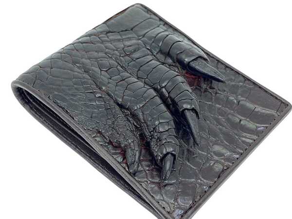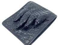 Folding wallet made of genuine crocodile leather, with a genuine crocodile paw on the front surface of the wallet. Folding wallet, inside consists of slots for cards and a pair of compartments for banknotes. Lining material: calfskin and textile.