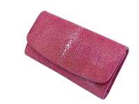 Long folded wallet made from genuine polished stingray leather. Genuine polished stingray hides used for manufacturing wallets of this model. Inside of this wallet are cars slots, compartments for banknotes, and zippered pocket. Calfskin and textile used as a lining material.