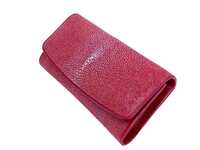 Long folded wallet made from genuine polished stingray leather. Genuine polished stingray hides used for manufacturing wallets of this model. Inside of this wallet are cars slots, compartments for banknotes, and zippered pocket. Calfskin and textile used as a lining material.