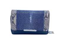 Rectangle women’s bag made from polished stingray skin with side inserts from genuine python skin natural color. Can use this handbag as a shoulder bag, as a clutch and as a handbag. Bag equipped detachable shoulder belt. On face of bag located flap, on bottom part flap locks on steel lock. Bag consist from few pockets and compartments. On backside of bag has wide flat pocket.