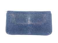 Zippered wallet made of genuine polished stingray leather. Genuine polished stingray hides used to make wallets of this model. Inside of this wallet are slots for cards, sections for banknotes, and zippered pockets. Removable handle made of genuine calfskin leather comes with the wallet. Calfskin used as a lining material.