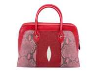 A roomy women's bag made of genuine stingray leather. The upper part of the bag has comfortable calfskin handles. The front and back of the bag are made of genuine stingray leather and genuine scaly leather. The stingray leather inserts are decorated with vertical white eyes. A convenient U-shaped zipper is sewn into the upper part of the bag. Inside the bag there are zipped and patch pockets. This model of bag can hold A4 documents, even folders. Soft fabric is used as a lining material. A removable shoulder strap is included.