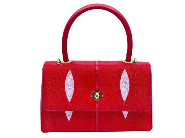 Chanel style bag made from genuine stingray leather. Face and back surfaces and flap decorated by vertical white eyes. On the top of bag located handle, distance from top of bag up to the handle -14cm. On backside of bag has flat pocket. Flap locked on front surface of bag on turn metal lock. Calfskin and soft cloth used as lining material. Shoulder belt in set of this bag.