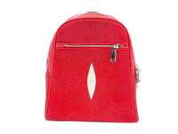 Medium-sized women's backpack made of genuine stingray leather. The front of the backpack is decorated with a vertical white eye. A zipper is sewn into the top of the backpack. The top handle is located at the top of the backpack. Adjustable straps are located on the back of the backpack. Fabric as a lining material.