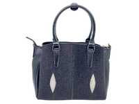 A large, roomy bag made of genuine stingray leather. The top of the bag has comfortable calfskin handles. The distance from the top of the bag to the top of the handles is 14 cm, which allows you to carry this bag both in your hand and on your forearm. The bag consists of a central compartment with a zipper and two side compartments with a magnetic button. Soft fabric used as a lining material. A removable shoulder strap is included with the bag.