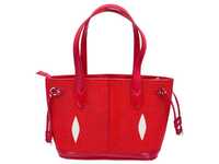 A voluminous and roomy women's bag made of genuine stingray leather. This bag can carry A4 documents even in folders. Convenient high calfskin handles sewn into the upper part of the bag. The height of the handles is 29 cm, which allows you to carry this bag in your hand, forearm, or on your shoulder. The front and backsides are made of stingray leather and decorated with vertical white eyes. There are decorative straps at the top of the side surfaces. The bag closes with a metal zipper sewn into the upper part. The bag is single-volume, with pockets inside. Soft fabric used as a lining material.