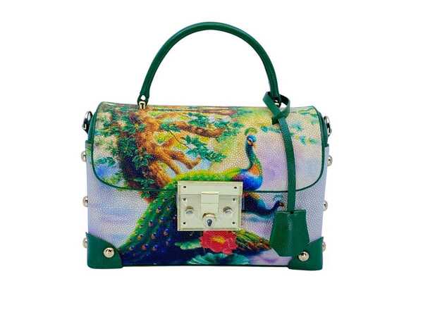 Modern women's bag made of genuine stingray leather, the bag decorated with a colorful print. At the top of the bag there is a handle, the height of the handle is 8-9 cm. On the front of the bag there is a massive metal mechanical lock of gold color. The bag decorated with gold buttons. Removable shoulder strap included. Calfskin and fabric used as lining material. Convenient pockets arranged inside the bag.