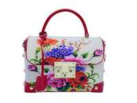 Modern women's bag made of genuine stingray leather, the bag decorated with a colorful print. At the top of the bag there is a handle, the height of the handle is 8-9 cm. On the front of the bag there is a massive metal mechanical lock of gold color. The bag decorated with gold buttons. Removable shoulder strap included. Calfskin and fabric used as lining material. Convenient pockets arranged inside the bag.