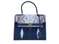 For manufacturing of this bag used genuine stingray leather with large grain and python skin belly part in natural color. On the top of bag located high handle, distance from the top of bag up to the handle- 12cm. On the face-side of bag has flap. Flap made from python skin, flap decorated by leather belt with lock. For opening this bag, you need pull flap up, flap fixed to the bag on magnet button. Stingray leather inserts decorated by vertical white eyes, two eyes on every side of bag. Bag equipped detachable shoulder belt. Bag inside made in one volume, inside of bag has pockets. Calfskin and cloth used as limning material.