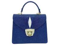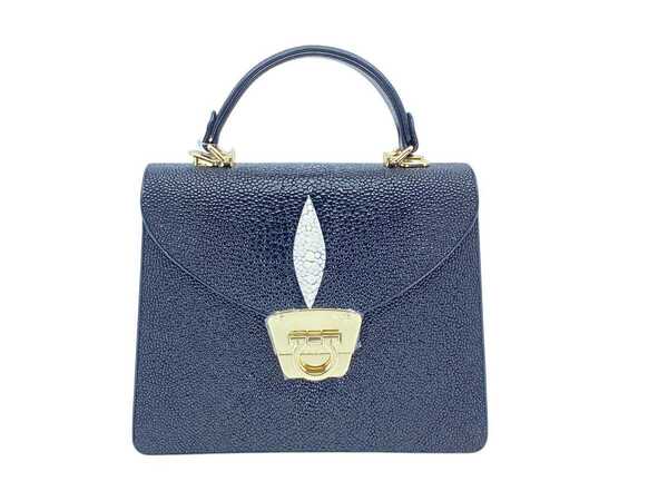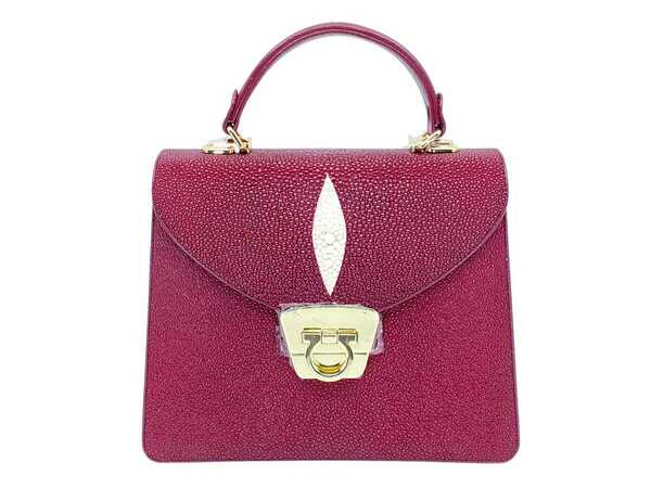 Women’s handbag made from genuine stingray leather. Women's bag is trapezoidal in shape, tapering towards the top. On the top of bag located convenient handle. The distance from the top of bag up to the handle is 9cm. On the face of bag located flap. Flap locks on gold metal turning lock. Both sides of the bag decorated by white eyes. On backside of bag has flat pocket. Bag inside consist from two compartments. Inside of bag has zip pockets and patch pocket. Calfskin and soft cloth used us a lining material. The bag is equipped with a removable shoulder strap. Length 130 cm, width 1.5 cm.