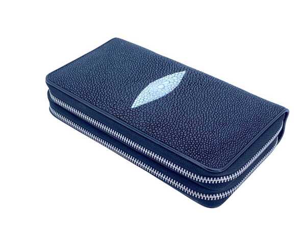 Genuine stingray hide used for manufacturing these wallets. This product can named a wallet and a clutch. This wallet made from one whole piece of stingray skin, on one side of wallet you can see big white-eye, white-eye on stingray leather it’s a typical and classical dyeing of stingray hides. By this white eye in process of dyeing marks large grain area on the middle part of stingray hides. Wallet consist from two independent compartments, inside of wallet has compartments for banknotes, documents, phone also have flat zip pocket and card slots. For more convenient clutch equipped side sliding handle.