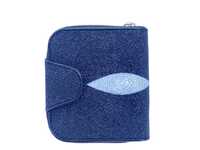 Small, folding, functional women's wallet made of genuine stingray leather. The wallet consists of an external zippered compartment, card slots, and a banknote compartment. The wallet is equipped with an external strap. Wallets of this model will appeal to those of you who prefer compact but functional wallets. Calfskin and textile used as lining materials.