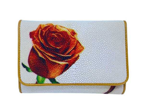 Convenient folding compact women's wallet with a compartment for coins. The wallet is made of genuine stingray leather. The wallet consists of a compartment for banknotes, a compartment for coins and slots for cards. Genuine calfskin and textile used as lining materials.