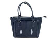 Large and comfortable, roomy and functional women's bag made of genuine stingray leather. Both sides of the bag are made of stingray leather and decorated with vertical white eyes. The side inserts of the bag are made of stingray leather and are also decorated with vertical white eyes. At the top of the bag there are high comfortable handles, the handles are made of calfskin. The height of the handles is 17-18 cm, which allows you to carry this bag both in your hand and on your forearm. Convenient flat pockets are made on the front and back sides of the bag. A metal zipper is sewn into the upper part of the bag, which closes access to the main volume of the bag. A flat zippered pocket divides the bag into two compartments inside. For ease of use, the bag has pockets inside. Soft fabric is used as a lining material.