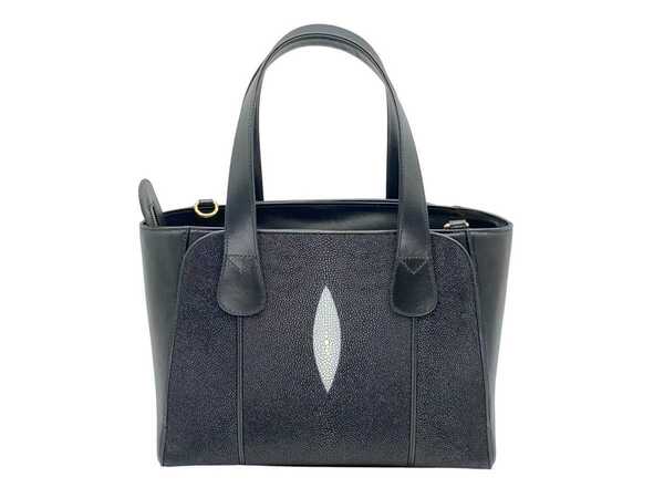 Large and comfortable, roomy and functional women's bag made of genuine stingray leather, size A4. Both sides of the bag are made of stingray leather and decorated with vertical white eyes. The side inserts of the bag are made of calfskin. At the top of the bag there are high comfortable handles, the handles are made of calfskin. The height of the handles is 17-18 cm, which allows you to carry this bag both in your hand and on your forearm. On the front and back sides of the bag there are convenient flat pockets with magnets. At the top of the bag there is a sewn-in metal zipper that closes access to the main volume of the bag. A flat zippered pocket divides the bag inside into two compartments. For ease of use, the bag has pockets inside. Soft fabric used as a lining material. A removable shoulder strap supplied with the bag.