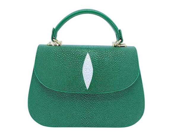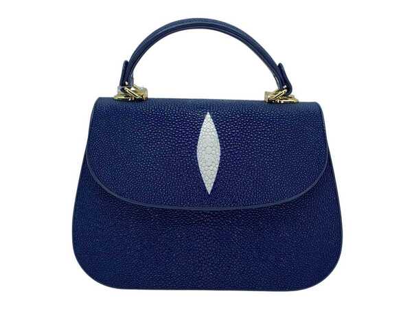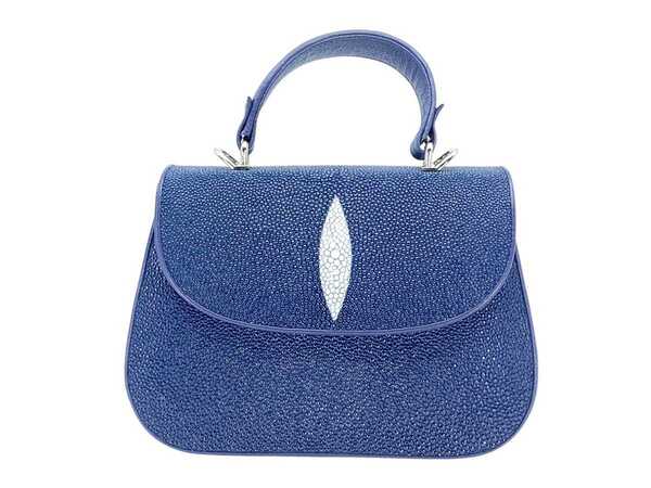 Women's bag made of genuine stingray leather. The top of the bag has a handle; the distance from the top of the bag to the handle is 9 cm. The bag is equipped with a removable shoulder strap. Inside of bag, there are pockets with zippers and a flat patch pocket. Soft fabric used as a lining material.