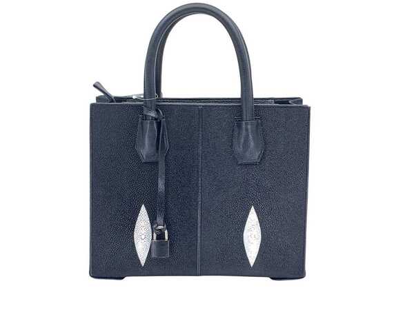 Fashionable, modern, women's bag made of stingray leather. The bag is rectangular. Both sides of the bag are made of genuine stingray leather and decorated with vertical white eyes. At the top of the bag there are comfortable handles, handles made of calfskin. A decorative cord with a decorative lock and key attached to one of the handles. The side inserts and the bottom of the bag are made of soft calfskin. The bag is equipped with a removable shoulder strap. At the top of the bag there is a metal zipper. A flat pocket with a zipper divides the bag inside into two compartments. Inside the bag there are comfortable pockets. Soft fabric used as a lining material.