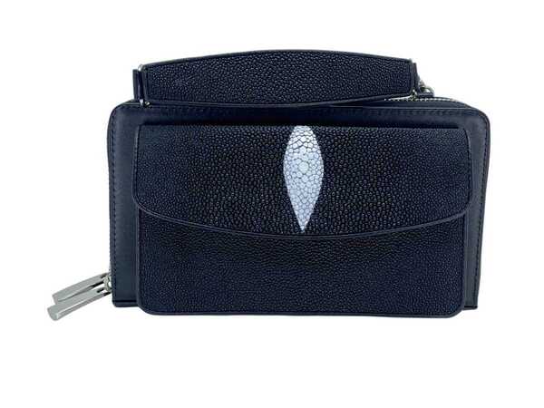 Genuine stingray leather used to sew this product. Both sides on this bag decorated by white eyes. On one side of clutch, made patch pocket. A removable handle attached to the top of the clutch. A removable shoulder strap is included with the clutch. The clutch consists of two zipped compartments. This clutch model is available in different colors.