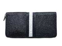 For manufacturing of this wallet used genuine stingray leather, wallet decorated by white strip. Wallet consist from banknote departments, card slots and one zip pocket for coins.
