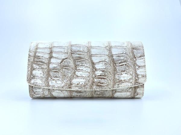 This is new model of vertical crocodile skin wallet, this woman's type of wallet. Wallets of this model keep up with the times, small compartment for cash, a few card slots, very cozy and convenient. On the side of wallet has flap with stainless steel button. For manufacturing of this wallet used genuine crocodile leather belly part. On the left side of wallet has convenient pocket with zip, this pocket can be used as a coin or pocket for another small items.