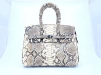 Python skin women's handcrafted handbag mini size, this handbag made as a prototype famous women's handbag Hermes. Handbag made. For manufacturing of this handbag used genuine python snakeskin. Used snakeskin top quality leather. On main surface of handbag as a main decoration located decorative strap with lock. As a natural decoration of handbag we can see belly structure. Handles, main surface, back surface, side parts made from genuine python snakeskin. At the top of the bag there is a zipper that closes the bag. Inside the bag is made in one volume, on the side walls there are pockets: with zippers and patch pockets. Soft sand-colored fabric used as lining material.