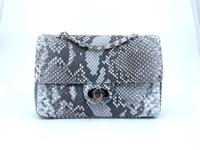 Python snake skin shoulder bag Chanel midi, made from genuine python snake leather. This model of bag manufactured in the shape of the famous Chanel bag, but does not have Chanel labels, just a copy of the popular and convenient shape. This shoulder bag is made in a comfortable midi size, quite spacious for a standard long wallets such a tri-fold long wallet or long zip wallet about 20cm long. There is a convenient patch pocket for a Smartphone inside this bag. The width of the pocket for the phone is 17 cm, which allows you to put a rather large modern Smartphone in this pocket. On the other side opposite to the patch pocket inside the bag there is a flat pocket with a zipper, zipper width 17cm. The chain design allows the bag to be worn on both the shoulder and forearm. The chain is braided with python skin, matching the color of the bag. Soft calfskin used as lining material