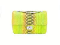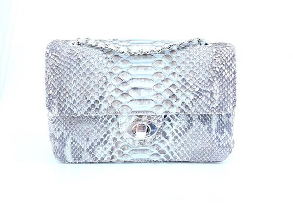 Python snake skin shoulder bag Chanel midi, made from genuine python snake leather. This model of bag manufactured in the shape of the famous Chanel bag, but does not have Chanel labels, just a copy of the popular and convenient shape. This shoulder bag is made in a comfortable midi size, quite spacious for a standard long wallets such a tri-fold long wallet or long zip wallet about 20cm long. There is a convenient patch pocket for a Smartphone inside this bag. The width of the pocket for the phone is 17 cm, which allows you to put a rather large modern Smartphone in this pocket. On the other side opposite to the patch pocket inside the bag there is a flat pocket with a zipper, zipper width 17cm. The chain design allows the bag to be worn on both the shoulder and forearm. The chain is braided with python skin, matching the color of the bag. Soft calfskin used as lining material