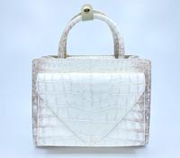 Crocodile skin women’s handbag, for manufacturing of this bag used most expensive and beautiful part of crocodile skin, belly of Siamese crocodile. As main decoration on front surface located convenient pocket with flap, this pocket looks like envelope. On the top of bag located handles from crocodile skin. Also on the top has width flap which closing inner part of handbag. All parts of bag made from crocodile skin, main surface, back part, side parts, handles, shoulder belt and bottom part. Inside bag made in one volume. Inside of bag has two pockets, one with zip and another one flat. Calfskin used as a lining material. Detachable shoulder belt with crocodile skin facing at set.