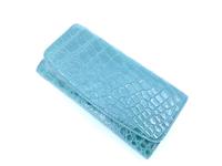 Long wallet for women trifold big size. For manufacturing of this wallet used belly part of genuine Siamese crocodile skin. This wallet is classical roomy wallet for those of you who prefer wallets with wide functional: 12 cards slots, two banknotes compartments, five long pockets one of those pockets with zip. Calfskin used as a lining material.