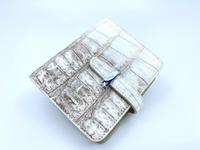 Crocodile skin women's wallet with coins compartment. For manufacturing of this wallet used most expensive part, belly of Siamese crocodile skin. Wallet made from one whole piece of crocodile skin. On main surface of wallet located staple for strap. Wallet consist from banknotes compartment, cards slots and small compartment with zip around which can be used as coins pocket. Calfskin and textile used as a lining material.