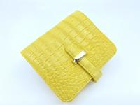 Crocodile skin women's wallet with coins compartment. For manufacturing of this wallet used most expensive part, belly of Siamese crocodile skin. Wallet made from one whole piece of crocodile skin. On main surface of wallet located staple for strap. Wallet consist from banknotes compartment, cards slots and small compartment with zip around which can be used as coins pocket. Calfskin and textile used as a lining material.