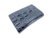 Crocodile skin trifold wallet for women medium size, wallet equipped coins compartment. For manufacturing of this wallet used genuine Siamese crocodile leather, hornback part of crocodile hide. Hornback part of crocodile skin has a very unique and unrepeatable texture of leather. On main surface of wallet, we can clearly see nice texture of hornback of croc skin, which becomes to the side and belly part of hide on the backside of wallet. This model of wallet made from one whole piece of crocodile skin what increasing valuable of this wallet. Interior part of wallet consist from One banknotes compartment, One ID slot with transparent window, four side pockets, one coins compartment and eight card slots. Calfskin and textile used as a lining material