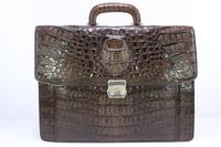 Crocodile skin briefcase made from genuine Caiman crocodile skin. On the front of the briefcase are located upward opening valve what decorated by natural unrepeatable texture nape of hide of Caiman crocodile. The back surfaces of this crocodile briefcase are made from texture hornback skin of Caiman crocodile. At the back side of this briefcase on the top is located convenient flat pocket. For greater flexibility and elasticity sides parts and bottom part are made from soft calfskin. Flat pocket on zip divided internal volume on two compartments. On front surface, under upward open valve, are located convenient flat pocket. Material of the lining is soft cloth and calfskin. Adjustable, made from calfskin, shoulder belt at set.