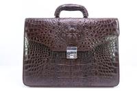Crocodile skin briefcase made from genuine Siamese crocodile skin. On the front of the briefcase are located upward opening valve what decorated by natural unrepeatable texture nape of hide of Siamese crocodile. The back surfaces of this crocodile briefcase are made from texture hornback skin of Siamese crocodile. At the back side of this briefcase on the top is located convenient flat pocket. For greater flexibility and elasticity sides parts and bottom part are made from soft calfskin. Flat pocket on zip divided internal volume on two compartments. On front surface, under upward open valve, are located tilting valve which contained one big flat pocket and cards compartments. Material of the lining is soft cloth and calfskin.