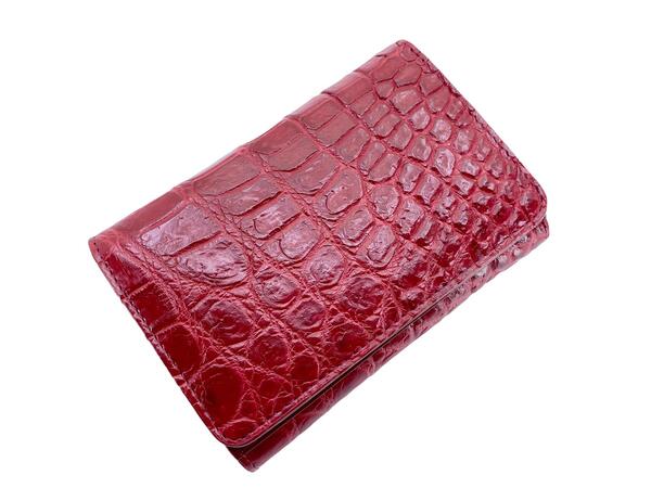 Long biker wallet made from crocodile skin horn back part. For manufacturing of wallet used Siamese crocodile skin soft and supple. The outer edges of the wallet are braided by black leather strip. The wallet closes with a strap with a metal button; the edges of the strap are braided.
