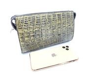 Siamese crocodile skin clutch with zip, tail texture. On main surface and on the back surface of this clutch we can clearly see unique tail texture of Siamese crocodile. On the top of clutch has zip. Side parts of clutch made from calfskin. Inner part of clutch made in one volume, inside of clutch has side pocket with zip. Detachable chain used as a shoulder belt at set. As a lining material used soft textile.
