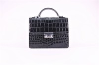 On main surface of bag located convenience flap with stainless steel lock, surface under flap made from crocodile skin belly part. Bag inside made in one volume has one zip pocket and one double pocket. On the top of bag has crocodile skin handle, back surface also made from belly part of crocodile skin. Side parts and bottom part of this handbag also made from crocodile skin. Detachable shoulder belt with crocodile skin on the top at set. As a lining material used calfskin black color.