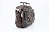 Men’s handbag from crocodile skin, for manufacturing of this handbag used genuine crocodile skin knee and elbow parts. This type of men’s bag is budget model. As a main decoration on the face surface nape part located. Also on main surface located convenience pocket with zip. On back surface of handbag also has convenience zip pocket. On the top of bag has handle made from crocodile skin. This model of bag is not big size and will be loved by those of you who like bags of medium size. This bag can be used as handbag and as shoulder bag. On sides of handbag has stainless steel rings for shoulder strap. Shoulder belt with crocodile skin on the top at set. As a lining material used soft cloth brown color. Inside of the bag has one more pocket with zip. The bag of this model was manufacturing in two colors black and dark brown in limited quantity.